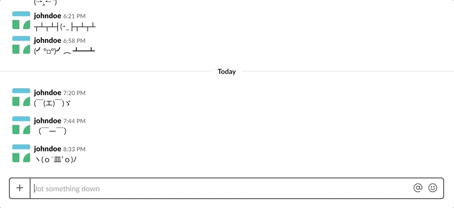A Kaomoji is a Japanese style of emoji, often using a creative combination of Japanese characters and punctuation to create unique faces. Traditional English keyboards make these kaomoji hard to reproduce without resorting to copy-pasting, so this app makes it easy to find and send Kaomoji, without having to leave Slack.